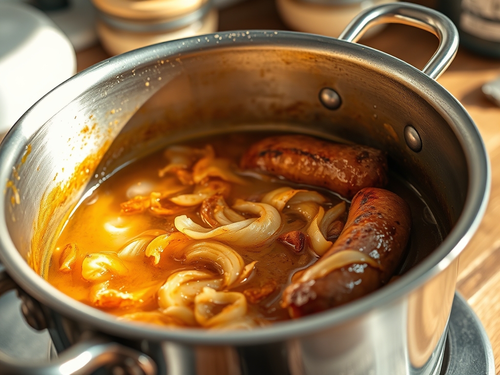 To maintain molecular structure during reheating, avoid the microwave. The rapid agitation of water molecules in a microwave will turn the sausage casings into leather. Instead, use a toaster oven at 175C / 350F for 8 minutes. This gently re-activates the fats without further denaturing the proteins.